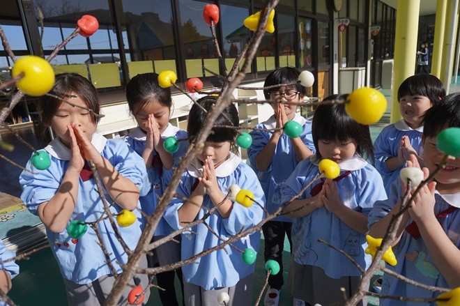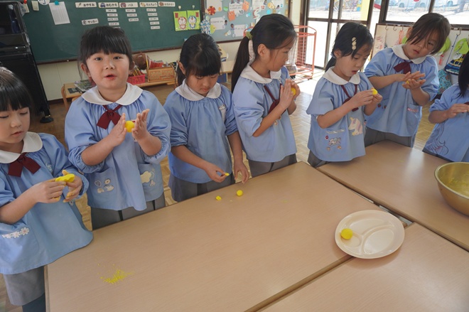 今日はみんなで小正月に飾られる正月飾りのまゆ玉作りをしました。
