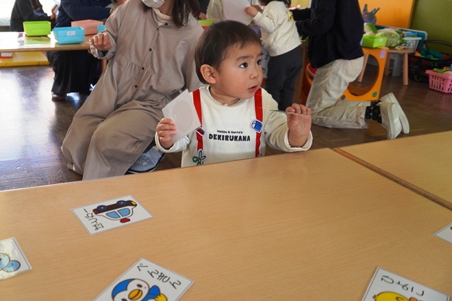 こまや福笑いにかるた、獅子舞のおもちゃで遊び、